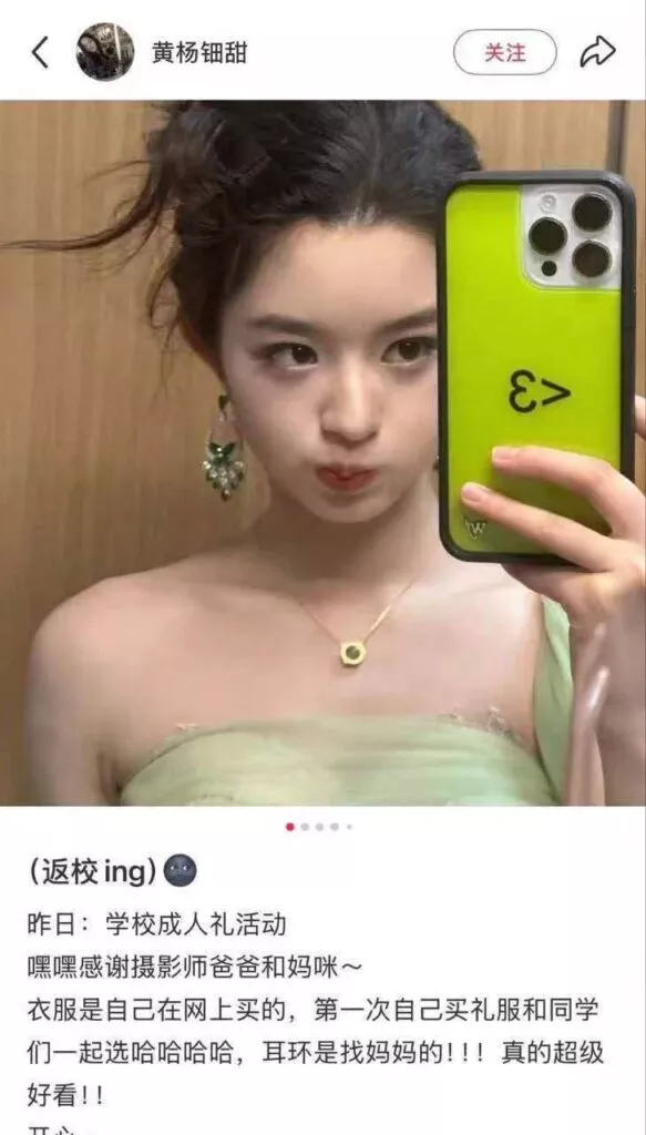 黄杨钿甜在网络上分享了她的成人礼照片。在这组照片中,她佩戴的耳环被认定为奢侈品牌GRAFF的经典系列,市场价约为230万元人民币。许多网友对此表示不满,认为出生于2007年的黄杨钿甜,作为一名年轻演员,不应有如此高的消费水平。5月14日下午,多条消息称她的父亲杨伟是四川雅安的一名公务员,随之引发了对其高额消费合理性的质疑。