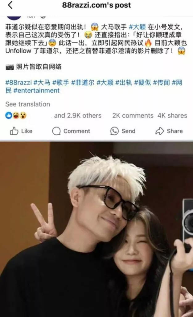 马来西亚华裔女网红大颖近日在网上发文,透露自己的男友菲道尔背叛了她,令她感到非常受伤。然而,令人意外的是,男方将两人私密视频曝光。大颖原本在享受游戏的乐趣,但此事无疑让她更加心痛。