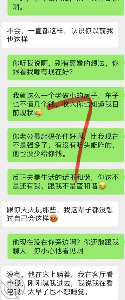 兄弟们,我最担心的事情还是发生了,昨天她老公回来了,这老兄也真逗的,我如果没记错她应该又快来大姨妈了,上次回来也是赶上来姨妈;今天也不知道是咋的了,到底是吵架了,还是就单纯的看着烦,问了也没跟我说具体的,反正所以就有了以下的聊天记录,哎,大家自己看吧,我现在真的是愁得很:兄弟们,虽然这个话题是略过了,但是我现在依旧还是很担心,女人这个东西吧,我是比较了解的,对于她们而言,尤其这种良家女,基本没有单纯身体出轨这一说,一定是身心一起的;虽然说是逗我的,但我不太相信,她一定是有这个想法,最起码是在那一瞬间是有这个想法了,而且还会纠结了很久才会发那条消息给我;说真的,这是我最担心的事情,我是不可能跟她过的,这点我很确信,首先我不想为了一棵小草放弃整片森林,我现在完全不想再有束缚,再有,我如果希望有个完整的家庭,那我肯定首选跟前妻复婚,再然后,我就算复不了婚,我大概率也不会去找个离婚的女人,