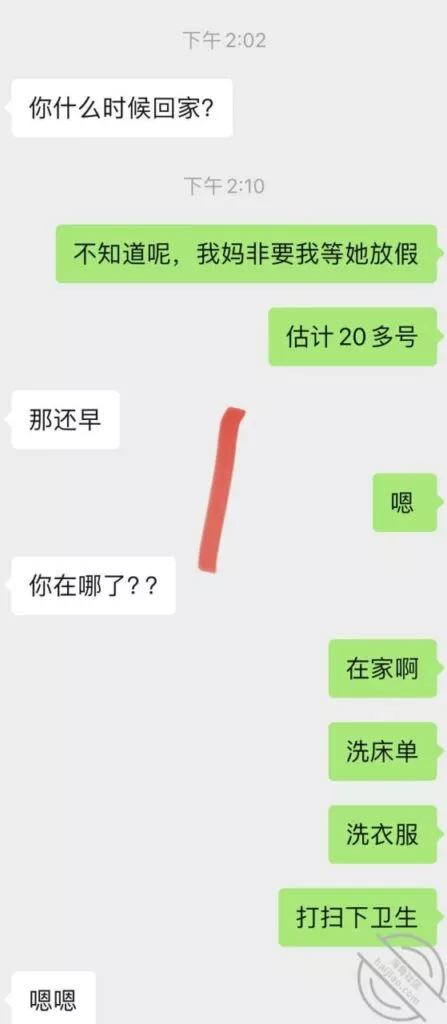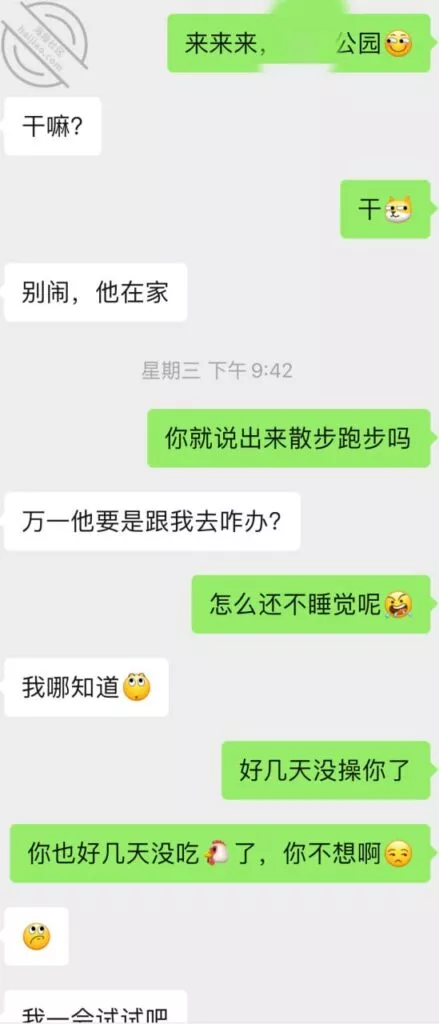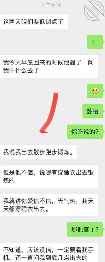 兄弟们差点出了大事啊,差点被他老公发现,幸好我们俩还都算机灵,然后她老公不算太机灵,不然可就惨了,后果不堪设想;事情是这样的,昨天她不是大早晨天刚亮就来找我Cao了一下吗,结果回去的时候她老公已经醒了,问题是她穿着睡衣出来的啊,我知道不管她怎么解释,她老公肯定是不会相信她的,现在心里肯定已经是怀疑她有人的,而且但凡有点脑子都能想到这个人肯定离得很近;先发聊天记录给大家看吧:以上就是昨天下午我俩的聊天记录了,本来昨天要发,结果呢临时有事情我要出去,才有时间登陆,兄弟们自己看吧;居然还跟踪她,这人脑子也是似乎有点不大够用,这种情况下跟踪能跟踪出个毛线啊,换了我,肯定装不知道啊,手机也不应该去查,就完全装不知道,完全相信她,叫她放松警惕,回头那不是一跟一个准啊,不过也算躲过一劫,真的要是被她老公知道我家地址,换了你们,会不会来敲门?这几天Cao不了了,还是暂且低调点吧,安全为主啊!也不知道这人啥时候走,我问她她也不知道,正好就当休息一下了。