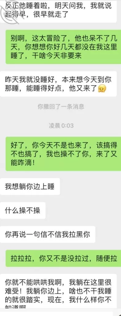 兄弟们,我居然被这个小娘们给拉黑了!事情是这样的,晚上我外面应酬喝多了酒,喝了酒以后么,大家都知道的,性欲大增,到家时间大概11点多吧,我想着也不是很晚,所以就联系他,让她来,上图大家自己看吧。聊天过程突然想到我俩还没vx,已经Cao了好几次了,连vx都没加人家,是不是太过分了,所以赶紧要了vx。总之最后她是没肯来,我也是喝了点酒,借着酒劲说话可能让她感觉有点冲了,我自己是没觉得哈,其实我觉得蛮正常的,然后………就把我删了,微信把我删了,那赶紧dy联系吧,没办法,为了当天晚上有BCao啊,结果发了两句话,居然……他妈的把我拉黑了,我想着今天肯定是完蛋了,就放弃了去睡觉,不过以为我没办法嘛?第二天,果断momo继续联系(看过前面帖子的朋友,自然会知道为啥有这么多联系方式哈)上面是momo聊天记录,太出乎我意料了,可能是这个女人就很好哄,或许也是气消了,总之没两句就加回来了。加回来以后,当时就邀约她晚上来,直接就同意了,后来我又问她想吃什么,其实跟吃饭也没关系了,也不需要这个步骤的,只不过我自己也要烧饭吃,之前说过的不喜欢吃外卖,都是自己烧菜吃
