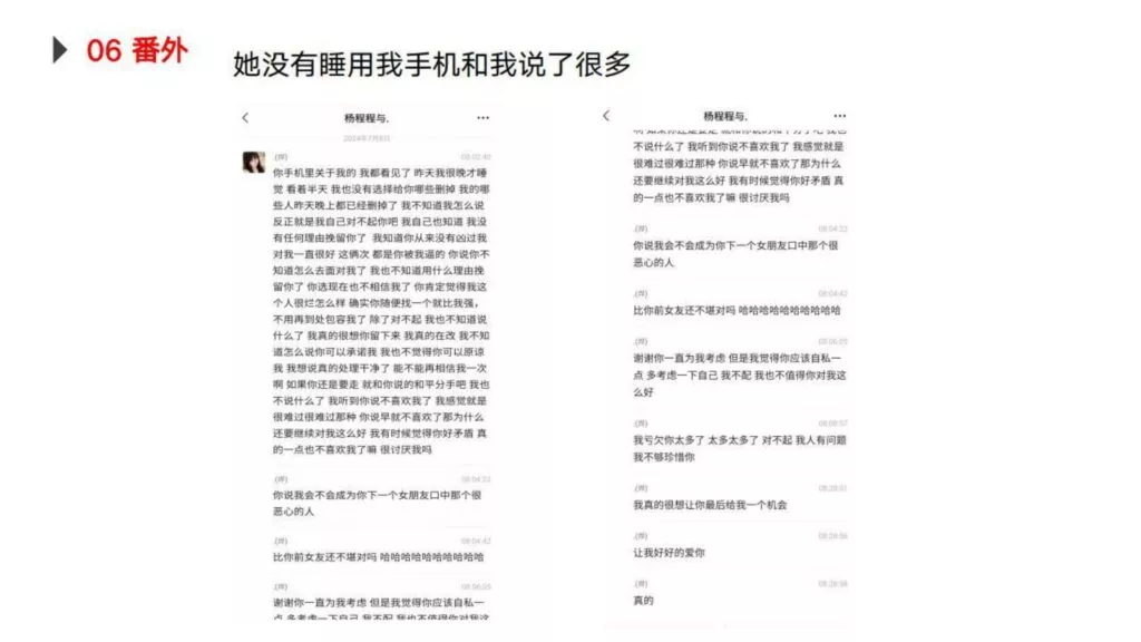 30页PPT揭露了杭州旅游职业技术学院的女学生翁晓烨的感情经历。在与前男友分手后,她迅速开始了新恋情,表面上看似寻求爱情,实际上却是为了寻找接盘侠。在玩弄男生感情的同时,她还与前男友保持暧昧关系。更令人震惊的是,她谎称自己怀孕,但实际上是因为前男友的怀孕而寻求接盘侠承担堕胎费用。