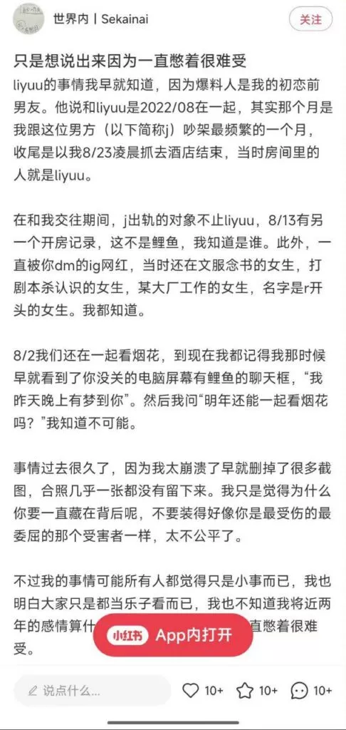 又有一位二次元圈内人士爆料,称这名男子是她的前男友。在得知男友出轨后,她去酒店捉歼,结果发现Liyuu鲤鱼正与她的男友在房间里亲密相处。