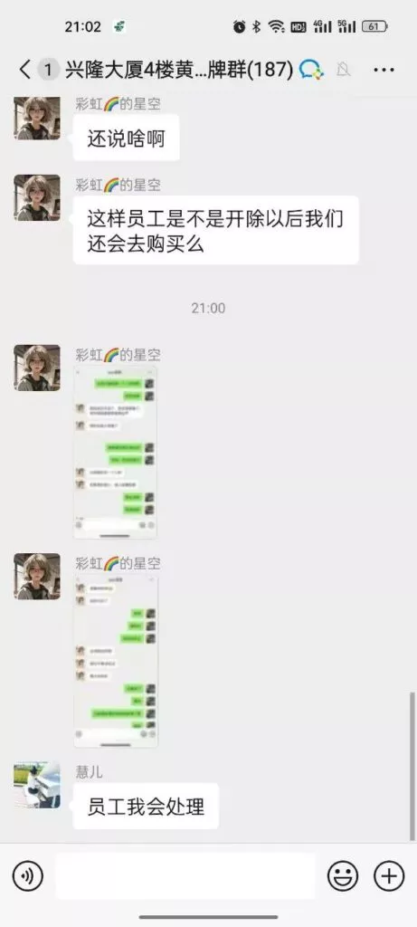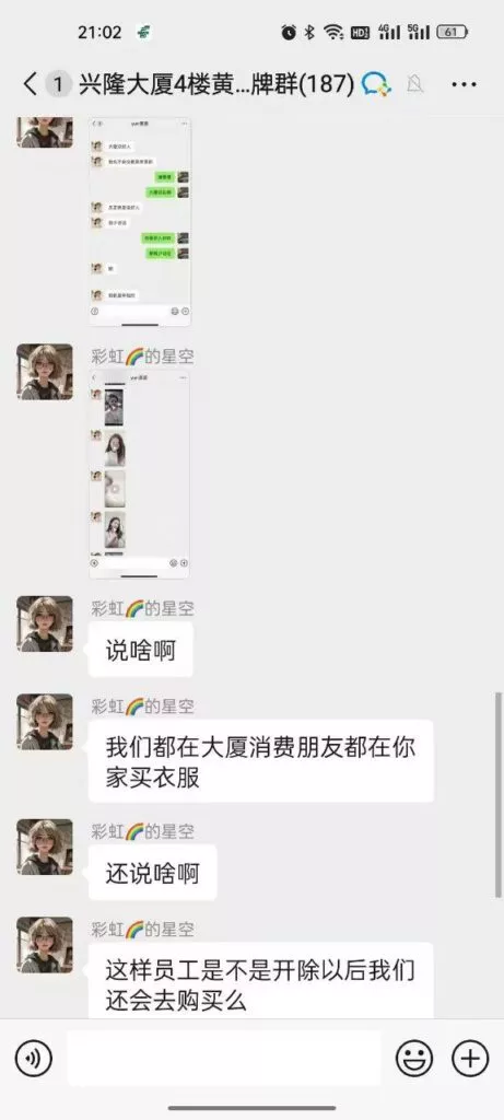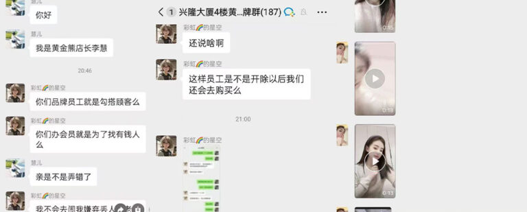 辽宁盘锦兴隆大厦黄金熊男装女导购员赵芸与已婚顾客私下关系暧昧,被正宫妻子发现后,在品牌微信群爆锤女销售,大量聊天记录被曝光。